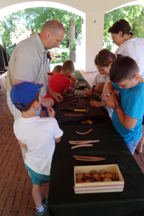 Tudósítónk a második napon látogatott el a Magyar Földrajzi Múzeum kertjébe, ahol a hőséget árnyék és lágy szellő enyhítette, a gyerekzsivajt pedig halk kopácsolás fűszerezte: épp bőrkarkötőt gyártottak a gyerekek, akik több díszítési mód közül választhattak, kedvük szerint. A foglalkozást Faragó Róbert, a Dr. Dizseri Tamás Habilitációs Központ szakmai vezetője irányította. Amellett, hogy különféle régi mesterségekkel, kézműves technikákkal ismerkedhetnek meg a gyerekek, hazavihetik az elkészült díszeket, ékszereket is, maradandó emlékként.