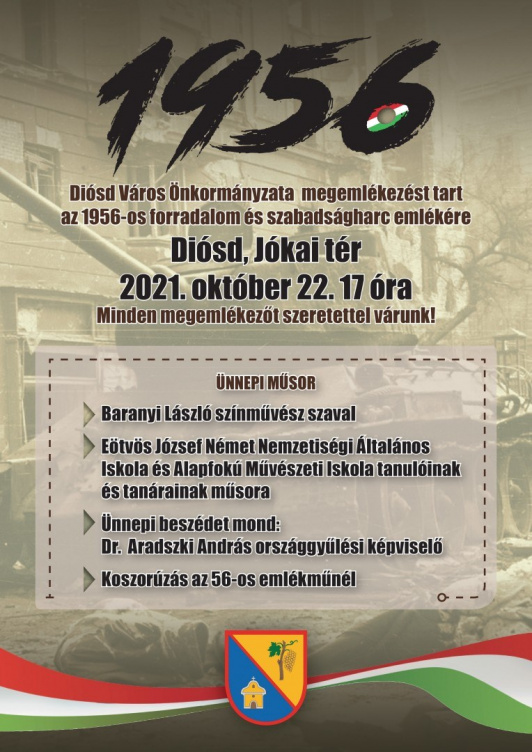 2021. október 22-én, 17 órától tart megemlékezést az 1956-os forradalom és szabadságharc emlékére Diósd Város Önkormányzata a Jókai téren.