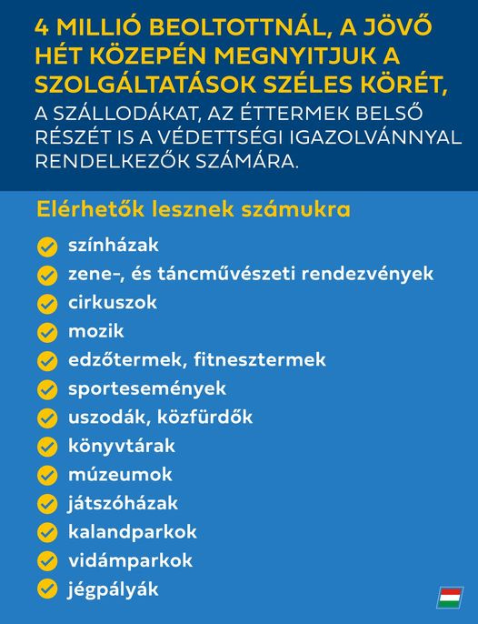 Megnyílhatnak a színházak, a tánc- és zeneművészeti események, a cirkusz, az edző- és fitnesztermek, a jégpályák, az állatkertek, a fürdők és uszodák, a játszóházak, a sportesemények, a kalandparkok, és kinyithatnak a szállodák, az éttermek belső helyiségei is.