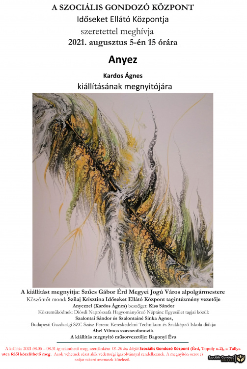 Minden hónapban bemutatkozik egy érdi művész az Időseket Ellátó Központ új épületében. Kardos Ágnesnek, azaz művésznevén Anyeznek - aki nyugdíjas építészmérnök, és 2009 óta él Érden - ez lesz az első kiállítása, tehát először találkozhat műveivel a közönség. Anyez akril pouring (azaz akrilöntés) technikával alkot.