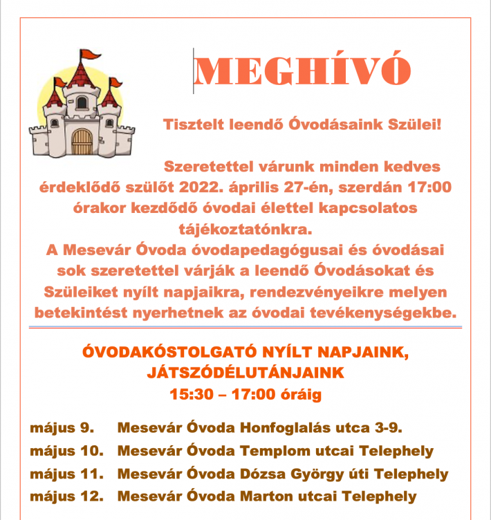 KözérdekűTárnok2022. március 28. 16:56erdmost.huÓvodakóstolgató TárnokonÁprilis 27-én 17 órától tájékoztatót, május 9-én, 10-én, 11-én és 12-én pedig nyílt napot és játszódélutánt tartanak a Mesevár Óvodában és telephelyein Tárnokon.