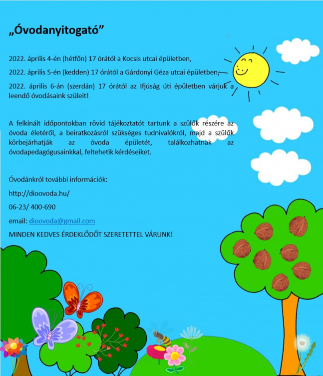 DiósdKözérdekű2022. március 24. 10:28erdmost.huÓvodanyitogató programok DiósdonÁprilis 4-én, 5-én és 6-án óvodanyitogató programokat tartanak a diósdi Dió Óvoda egy-egy épületében. A beiratkozást április 20-án és 21-én 8 és 17 óra között, 22-én 8 és 12 óra között tartják.Bővebb információt a beiratkozásról itt találnak.