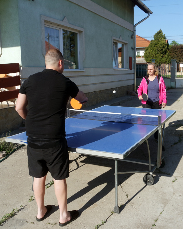 „Tizenkét pszichiátriai beteg él a házban állandó felügyelet és segítség mellett. Napi háromszori étkezést kapnak, hétvégén pedig közösen főzünk. Az itt élők önellátásra csak támogatással képesek, de közülük többen is lelkesen vesznek részt a közös tevékenységekben” – mondja Víg Ágnes, a ház vezetője. „Most, hogy nem tudnak kijárni, házon belül igyekszünk még több programot biztosítani számukra: kertészkedünk, sportolunk. Ezt az időszakot arra is kihasználtuk, hogy lomtalanítsuk a lakószobákat.Igaz, a már nem használt tárgyakat most nem tudjuk elvitetni, de azzal is telik az idő, hogy ezeket rendszerezzük és elhelyezzük. A mozgás kötelező, délelőtt és délután is. Sokan ajánlottak fel segítséget a számunkra, a Harmóniáért Egyesülettől pingpongasztalt kaptunk kölcsön, és szert tettünk egy Flabelos-gépre is. Nagyon sokat jelent, hogy a lakók érzik, odafigyelünk rájuk.Az egyik, segítséget felajánló ismerősömet például arra kértem, beszélgessen telefonon az egyik ügyfelünkkel, akinek épp erre volt szüksége. Tudjuk, hogy most ők is bizonytalanabbak, félnek a fertőzéstől. Nagyon odafigyelünk nemcsak arra, hogy lelkileg rendben legyenek, hanem a takarításra, fertőtlenítésre is – a lakók ebből is kiveszik a részüket –, és arra, hogy mi, dolgozók a lehető legkevésbé érintkezzünk másokkal, nehogy mi fertőzzük meg őket”.