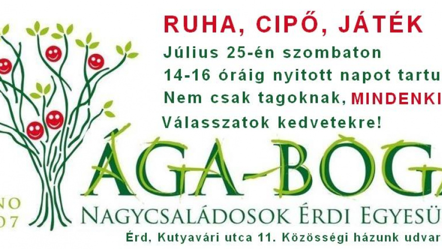 Szabadon válogathatnak játékok, ruhák, cipők közül nemcsak az egyesület tagjai, hanem minden érdeklődő július 25-én szombaton 14-16 óra között az Ága-Boga Nagycsaládosok Érdi Egyesületének közösségi házában, a Kutyavári út 11. szám alatt.