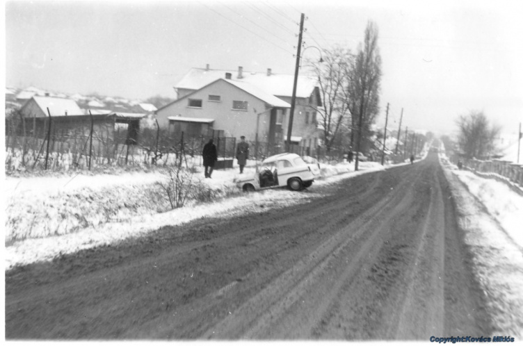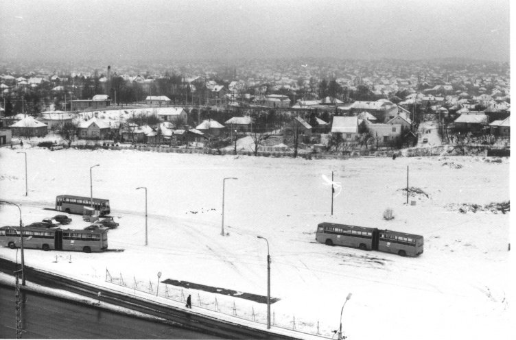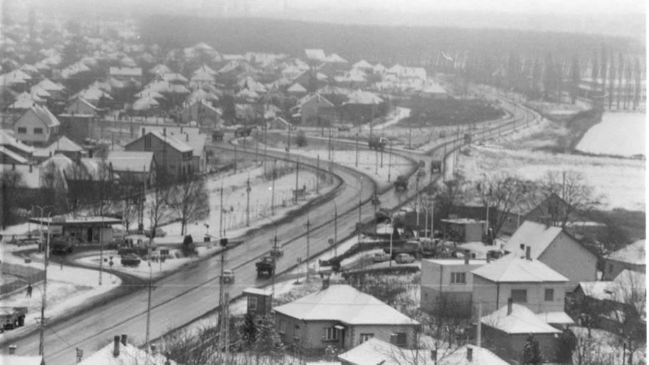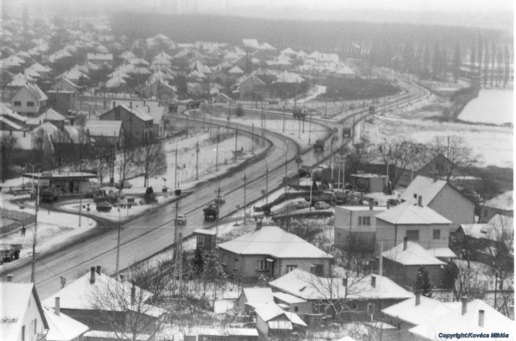 Budai út, két oldalt benzinkút, a mostani tescós körforgalom elődje, 1984 tele (fotó: Kovács Miklós)