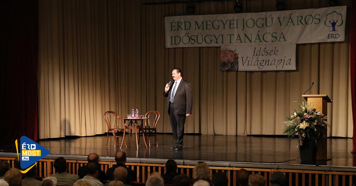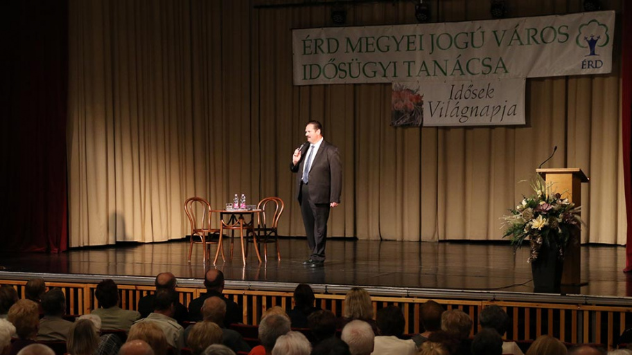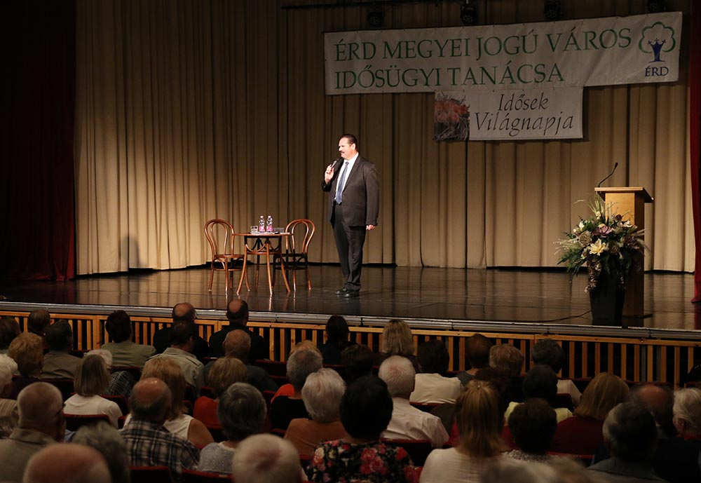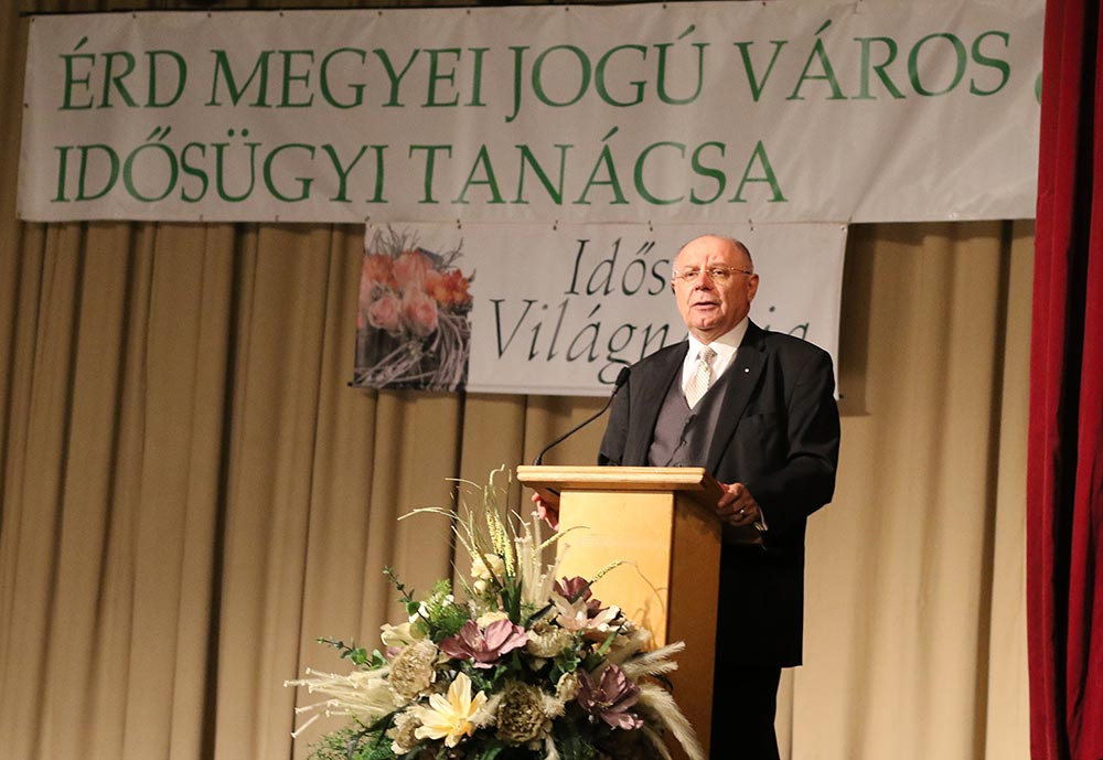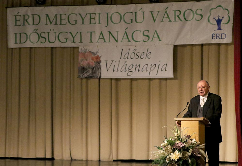 - 1990 óta minden évben 1000-1200 ember költözik be városunkba, akiknek a zöme igaz, hogy fiatal, de mindig jönnek idősebbek is. Aki pedig egyszer gyökeret vert Érden, már nem költözik el, azaz itt fog megidősödni, és így alakul ki a városunk. Amit éppen azok az emberek építettek, akik annak idején még fiatalon ideköltöztek. Lassan meg majd a mi fiaink és unokáink is elmondhatják, hogy Érdet mi is építettük. Egymásra épül a társadalom, a nemzedékek, és ez a jó. Úgy egész a város, ha van benne idősebb, fiatalabb és gyermek is. Ha önökre gondolunk, akik szerintem ugyanolyan szomorúan veszik tudomásul, ha a gyerekek elköltöznek, akkor el kell gondolkodni azon is, hogy mi a társadalom kötelessége önökkel szemben. Mert amikor erősek voltak, amikor építettek és mindenben részt tudtak venni, akkor a társadalom igénybe vette az erejüket, a képességeiket. Most rajtunk a sor, hogy mi is segítsünk, mi is visszaadjuk valamit abból, amit önök adtak annak idején magukból. Ez a város odafigyel az idősekre, mert odafigyel a kapcsolatokra, és próbálja ösztönözni a fiatalokat, hogy vegyenek részt ebben a munkában. Maga a város is csak akkor egész, ha a kisgyermektől a dédszülőkig mindenkit egybe tudunk foglalni. Mindenki ugyanolyan fontos részét alkotja Érdnek. Kívánok sok egészséget, szerencsét, hogy a családjuk és a város szerető közegében tudják leélni az életüket.