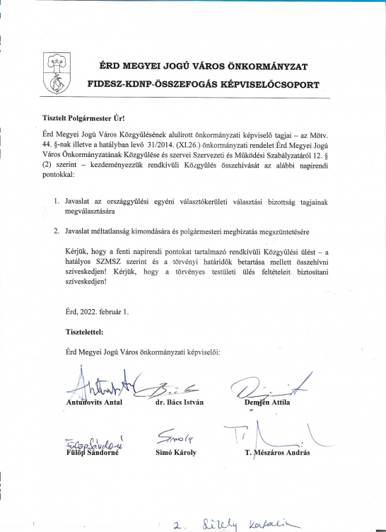 Soron kívüli ülés összehívását kezdeményezi az Érdi Fidesz. Azért szeretnék összehívni a közgyűlést, mert szeretnék, ha mihamarabb megválasztanák az országgyűlési egyéni választási bizottság tagjait, továbbá megszüntetnék a polgármester megbízatását is.