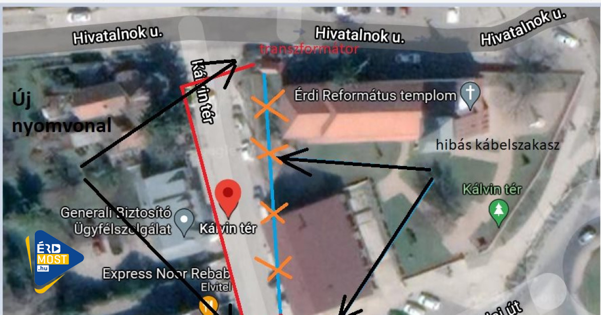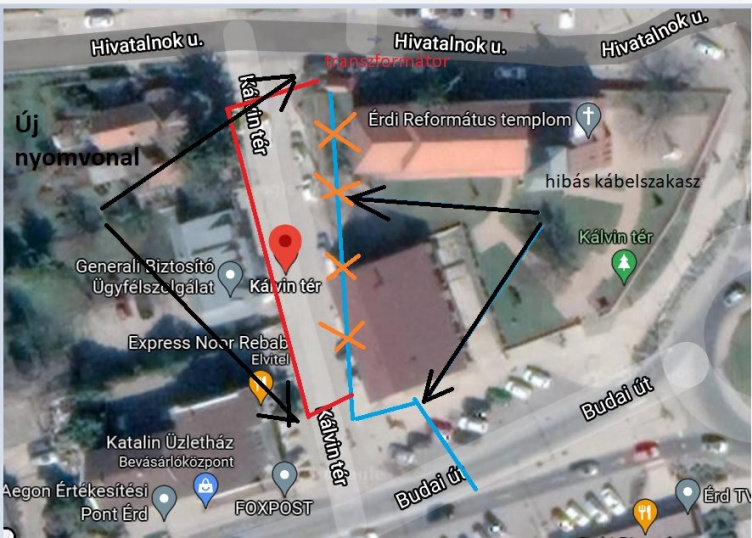 A térképen a piros színű az új nyomvonal. Kék színű a hibás, magánterületen haladó régi kábel nyomvonala.