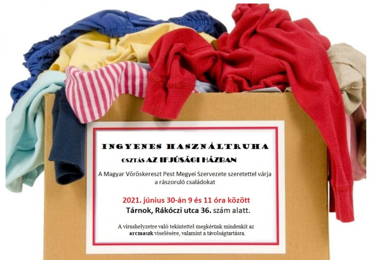 Június 30-án a tárnoki Ifjúsági Házban ingyenes használtruha-osztást tartanak a Magyar Vöröskereszt közreműködésével, 9 és 11 óra között.