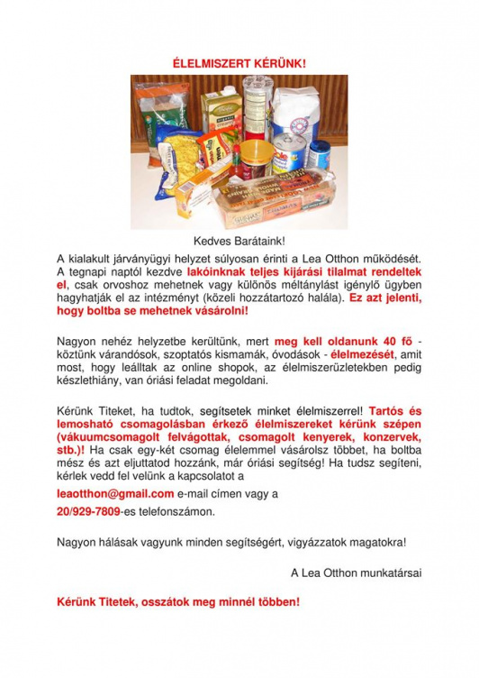 A Lea Otthon intézményvezetője, Varga-Hegyi Eszter az Érd FM 101.3 megkeresésére azt a tájékoztatást adta, hogy az önkormányzat a gyermekek közétkeztetését és a felnőttek napi egyszeri étkeztetését tudja biztosítani majd, a többi négy étkezéshez (reggeli, tízórai, uzsonna, vacsora) most tartós élelmiszert és tisztálkodási szereket kérnek támogatóktól, adományozóktól.