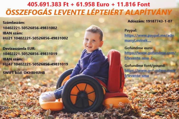 Levente decemberben lesz kétéves, a Zolengsma nevű gyógyszert azután már nem kaphatja meg. Segítsünk ennek a kisfiúnak is, hogy lábra állhasson! Ha nem tud egyik adománygyűjtésen sem megjelenni, de szívesen támogatná Levit, a következő módokon is megteheti: