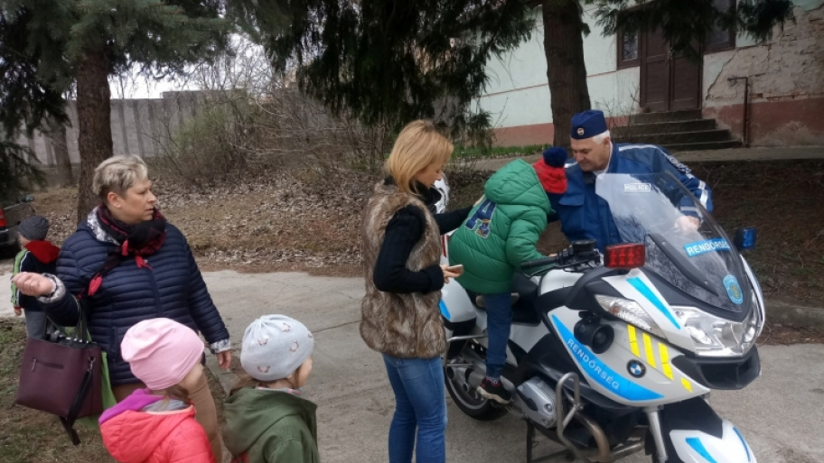 A rendőrség munkatársai játékos formában tartottak előadást a gyerekeknek, akik beülhettek a rendőrautóba, felszállhattak a rendőrmotorra, megtekinthették az előállító helységet, majd a foglakozás végén a témákhoz kapcsolódó kifestőket is kaptak ajándékba.