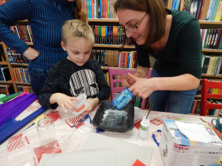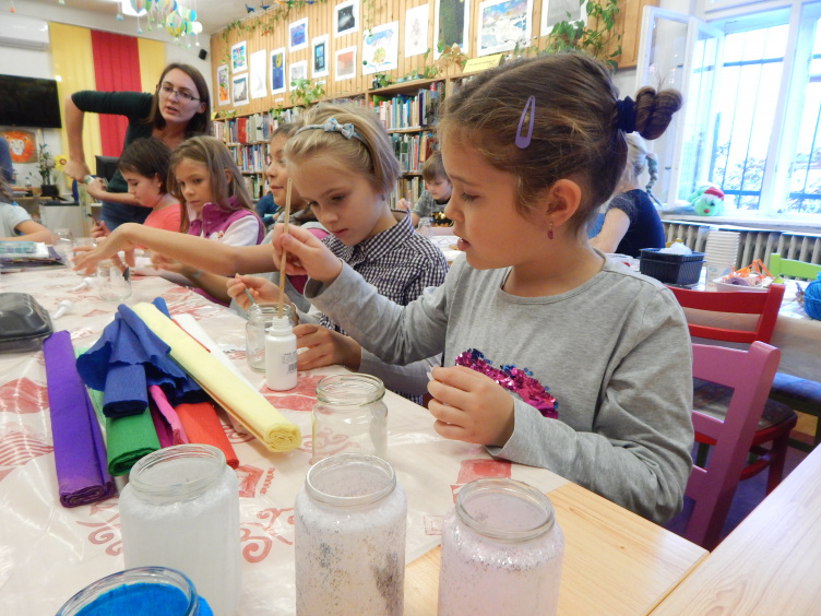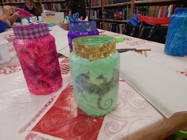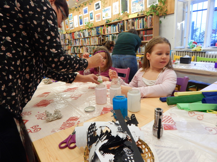 A kicsik és nagyok ez alkalommal szüleikkel, nagyszüleikkel érkeztek a gyerekkönyvtár rendezvényére, hogy együtt készítsenek lámpásokat miután Kondriné Varga Kornélia felolvasta nekik Bartos Erika Bogyó és Babóca meséi közül a Lámpásokat. Az asztalokon egy nagy doboznyi egykor volt bébiételes üveg várta, hogy sárkányos, tündéres vagy házikós minták, krepp papír, no meg egy kis csillámpor kerüljön rá, aztán otthon mécses beléjük, és fényt hozhassanak az éjszakába.