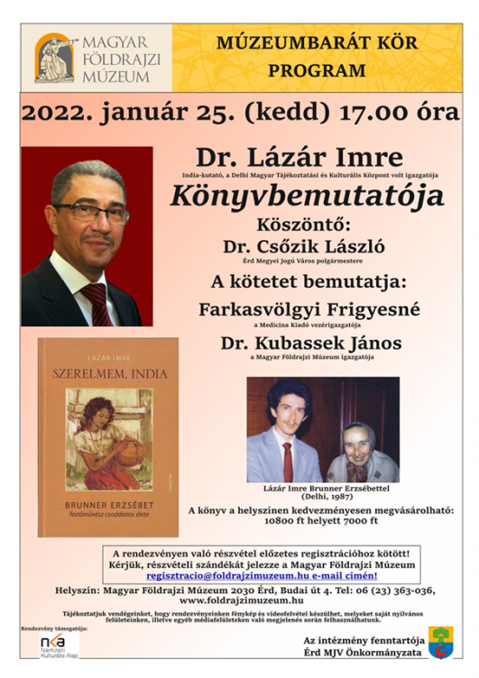 Január 25-én, kedden 17 órakor Dr. Lázár Imre: Szerelmem, India című könyvének bemutatójára kerül sor. Köszöntőt mond Csőzik László polgármester, a könyvet Farkasvölgyi Frigyesné, a Medicina Kiadó vezérigazgatója és Dr. Kubassek János, múzeumigazgató mutatja be.