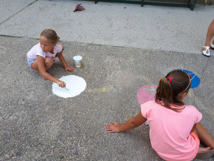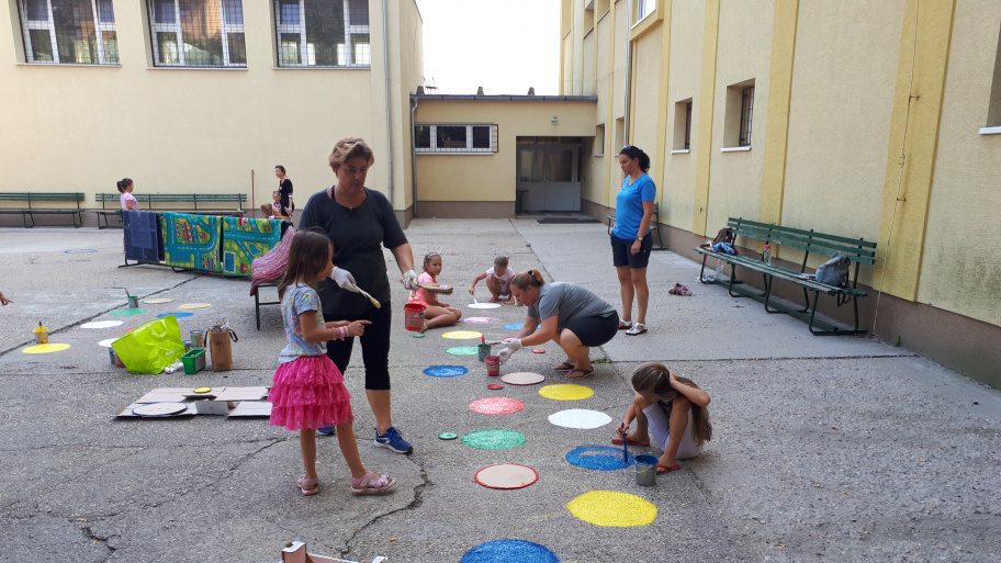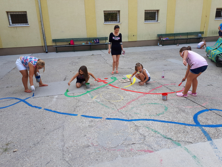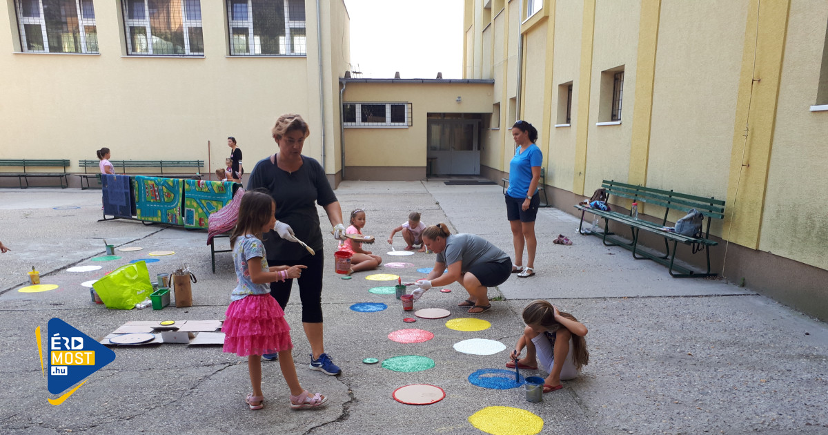 A játékfelületek története még tavaly kezdődött, amikor is az egyik, akkor első osztályos gyermek édesanyja azon kezdett el töprengeni, mivel dobhatnák fel az iskola szürke betonudvarát, és hogyan tehetnék kicsit tartalmasabbá a gyerekek számára a kintlétet a szünetekben. Somkutiné Bitskey Katalin nem sokáig töprengett, az interneten rengeteg ötletből nyert ihletet, és rájött, hogy nincs is túl sok mindenre szükség a nemes cél eléréséért. Csak betonfestékre, sablonokra, egy kis kreativitásra, meg persze pár szülő összefogására és „szabadidejére”. Az eredmény akkor magáért beszélt: az Érdligeti suli alsósai imádták a játékokat, amiket szüleik festettek fel az udvarra, és amik idővel a rajtuk ugráló, szaladgáló tappancsok alatt elég rendesen el is koptak. Ezért volt szükség múlt héten az újrafestésre. Ebben egyébként nemcsak a szülők vettek részt, de maguk a diákok is, akik alig várták, hogy újra felvarázsolják a betonra a már megismert és megszeretett játékaikat, vagy éppen egy vadi újat.