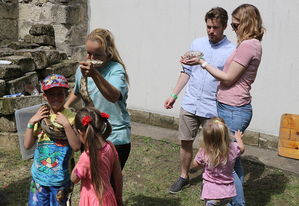 Kicsit feljebb, a nagyszínpad felé félúton elkerített kis zugban kaméleon sütkérezett a bokrokon (ha nem éppen gazdája fején tette ugyanezt), kecske és csüngő hasú vietnámi törpemalac szuszogott az árnyékban, boa, vadászgörény, afrikai fehérhasú törpesünök, görög teknősök és csincsillák várták a piciket és nagyokat, hogy Vali, a gazdájuk bemutassa őket nekik. Szabó Andrásné Horváth Vali a tavalyi állatfelhozatallal és az ideivel is lenyűgözte hálás kis közönségét, akik szorgosan tépkedték a pitypang leveleit, ha épp megéhezett a görög teknős, és a vörösfarkú boát sem féltek a nyakukba venni. És ha ezeket az állatokat nem is, szemközt, a lufihajtogató bohóctól lehetett kérni lufiból profi módon kreált katicákat és teknősöket, amiket haza is lehetett vinni.