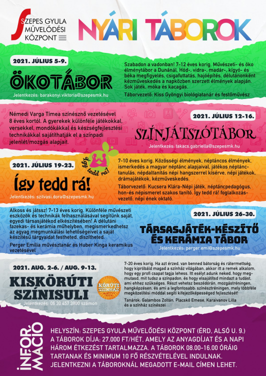 Június végétől augusztus közepéig a legkülönfélébb táborokkal várja az érdeklődőket a Szepes Gyula Művelődési Központ, amely a nyár folyamán öko-, színjátszó-, néptáncos-, társasjáték-készítő- és kerámiatábort is szervez.