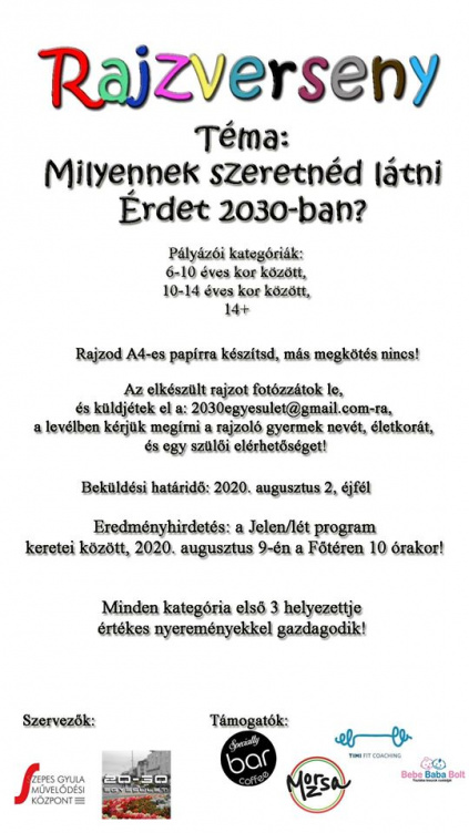 Rajzversenyt szervez a Szepes Gyula Művelődési Központ és a 2030 Egyesület, témája: milyennek szeretnéd látni Érdet 2030-ban? A műveket három kategóriában várják, a legügyesebbek, illetve legkreatívabbak értékes nyereményekkel lesznek gazdagabbak.