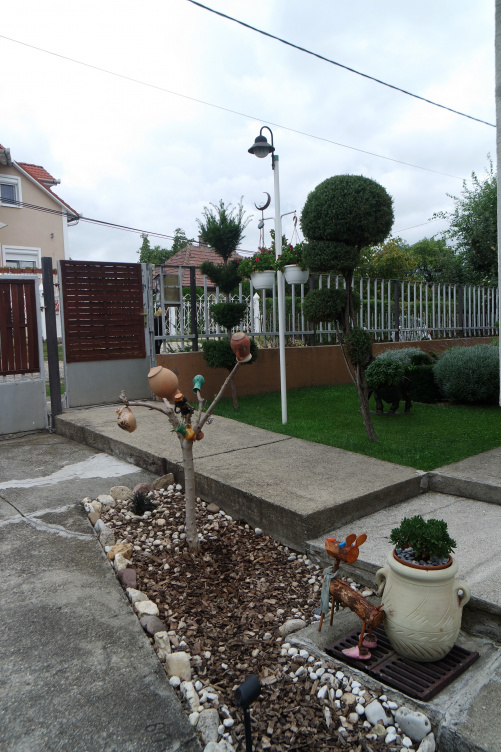 Természetesen nem magától, hanem az állandó gondozástól olyan a fű, mintha újonnan vetették volna. Az osztrák benyomások után jöttek a horvát impressziók: Zoltánék kertje tele van leanderrel, amelyeket télire sem visznek be. „Kövekkel építem körbe a gyökér feletti részt, és télire ezt az üreget telerakom mulccsal, a növény ágait pedig fóliával takarom le” – magyarázta. A leanderekkel jól megfér a szépséges selyemakác, a különböző alakúra nyírt tiszafák csapata, és a pompás, bíborszínű gyümölcsöket hintáztató almafa. Merthogy az egzotikusabb örökzöldek és lombhullatók mellett vannak gyümölcsfák és bokrok is, fügétől a szőlőn át a málnáig, és az egyik kerítésnél még egy magaságyás is helyet kapott, ahol a zöldségek teremnek. Mindez úgy elrendezve, hogy a szemnek kellemes és harmonikus, és egyik elem sem üti, zavarja vagy nyomja el egymást.