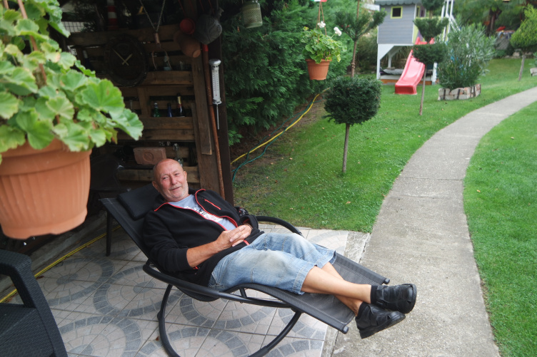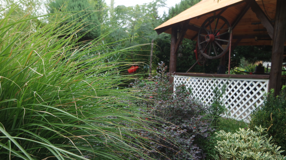 Zoltánnak van egy fedett kis kuckója, pár régi berendezési tárggyal és egy kényelmes nyugággyal – ide szokott kiülni, nézegeti a kertjét, és közben hallgatja a rádiót… Bár hideg, esőre hajló idő volt, mikor ellátogattunk hozzájuk, a sok örökzöld visszahozta a nyár intenzív, harsogó színeit. „Az is jó bennük, hogy kevesebb velük a munka” – mondta gyakorlatiasan Zoltán, aki elvezetett a szaletlihez is, amelynek épp most cseréli le a tetejét. Jó pár dolgot barkácsolt már a kertben, a dísztalicska kerekét is ő készítette, miután az eredeti tönkrement, és faragott már más díszeket is. Az „újrahasznosításban” is jeleskedik: elpusztult egy meggyfája, ki kellett vágni, de a törzs alsó részét meghagyta, lekezelte, majd a törzset kivájta, és sziklakerti növényeket ültetett bele. Mivel a rönk kint van az utcán, sokan megállnak előtte, és megcsodálják (remélhetőleg otthon meg is valósítják az ellesett ötletet). A számtalan virág mellett helyet kapott a kertben egy játszóház is – ez már az unokák örömére. „A szív és a lélek tartja fenn a kertünket” – mondta mosolyogva.