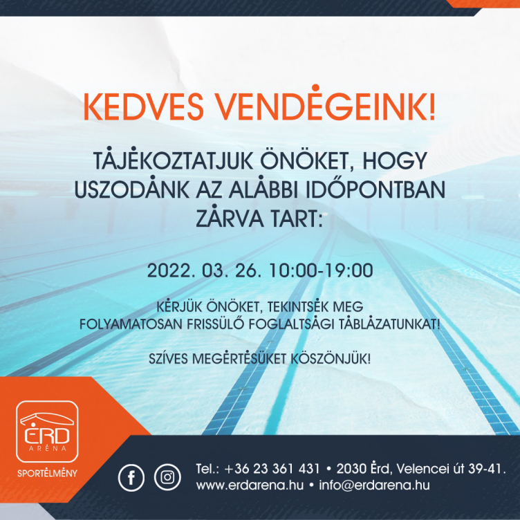 Közérdekű2022. március 22. 12:12erdmost.huSzombaton 10-19 óra között zárva tart az uszodaMárcius 26-án, szombaton 10 és 19 óra között zárva tart az Érd Aréna uszodája. Az ezt megelőző és az ezt követő időszakban a szokott módon látogatható az uszoda. forrás: erdarena.hu