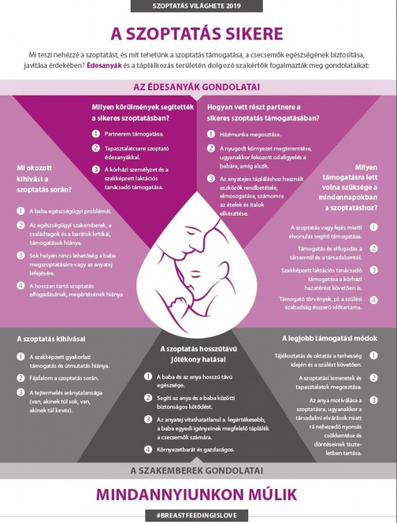 Az anyatejes világhét idei jelmondata: "A szoptatás sikere mindannyiunkon múlik!". A szoptatás ugyanis csapatmunka. Noha a szoptatásban az édesanyák szerepe elsődleges, a férjek, partnerek, családok, munkahelyek és közösségek szoros támogatásával a szoptatás sikeresebbé válhat. Az idei kampány arra szólít fel mindannyiunkat, hogy olyan támogató környezetet hozzunk létre, amely segíti a szülőket szoptatási céljaik elérésében. A támogató környezet kialakításához elengedhetetlen többek között a szülők és családok korszerű szoptatási ismeretekkel való ellátása, az egészségügyi szakemberek továbbképzése, bababarát közintézmények, munkahelyek és egészségügyi intézmények létrehozása. A 2019-es kampányban kiemelt szerepet kapnak az édesapák. Biztassuk és támogassuk őket abban, hogy ugyanolyan mértékben vehessenek részt családjuk, gyermekeik életében, mint az édesanyák!