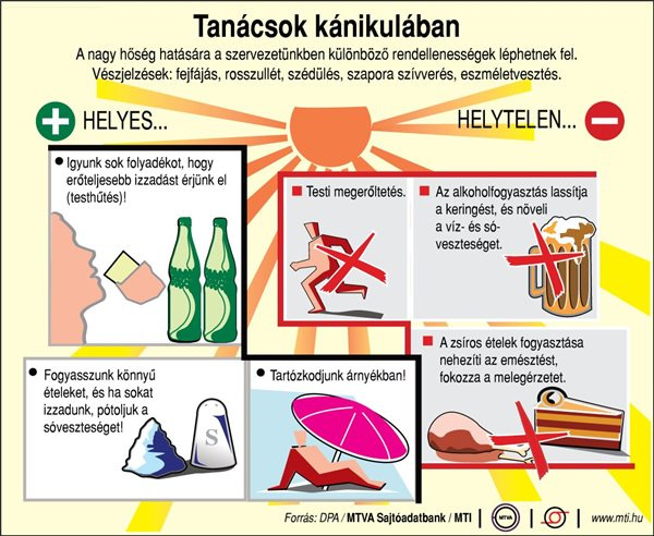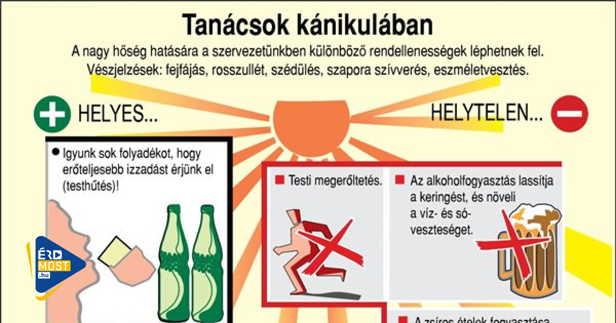 időjárás2021. július 07. 09:16erdmost.huTanácsok kánikulábanA nagy hőség hatására a szervezetünkben különböző rendellenességek léphetnek fel. Vészjelzések: fejfájás, rosszullét, szédülés, szapora szívverés, eszméletvesztés.