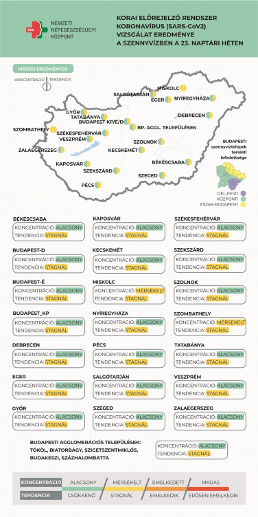 A 23. héten a szennyvízben mért SARS-CoV-2 koncentráció országos átlaga enyhe csökkenést mutat, szintje közelít a tavaly nyáron megfigyelthez. A 22 vizsgált minta kategória-besorolása többségében már nem változott, vagyis alacsony az új koronavírus szennyvízben mért koncentrációja. Szombathelyen és Miskolcon mérsékelt a koncentráció, emelkedő tendencia azonban az említett két város esetében sem figyelhető meg - írja az NNK.