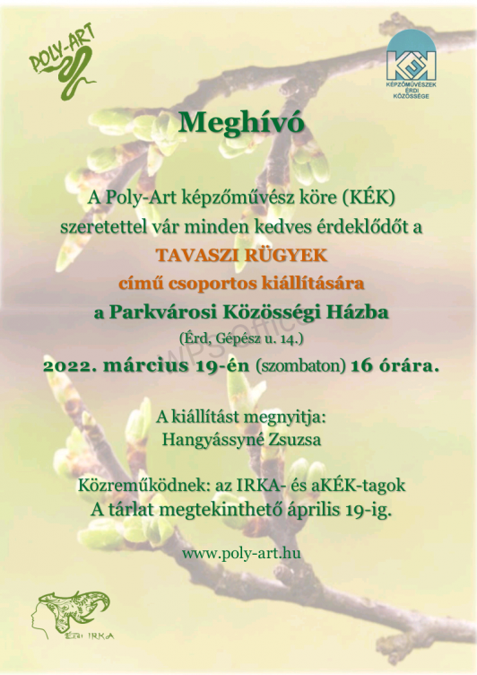 Március 19-én, szombaton 16 órakor nyílik meg a Parkvárosi Közösségi Házban a Poly-Art képzőművész Köre (KÉK) Tavaszi rügyek című csoportos kiállítása . A kiállítást Hangyássyné Zsuzsa nyitja meg, a tárlat április 16-ig tekinthető meg.