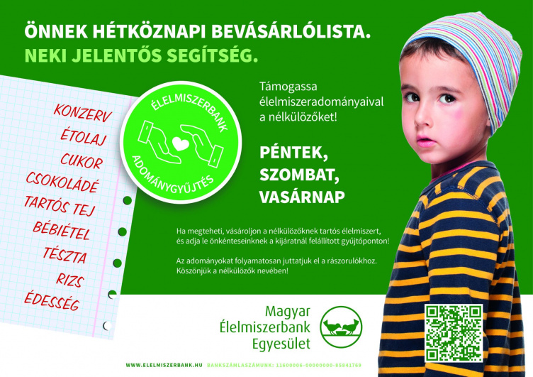 Az adventi időszak kezdetén ismételten adománygyűjtést szervez a Magyar Élelmiszerbank Egyesület és a városi Szociális Gondozó Központ. A gyűjtés során tartós élelmiszereket várnak, amiket a helyi rászorulók közt osztanak szét, ezzel talán szebbé téve a karácsonyukat.
