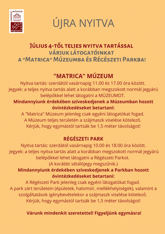 Kultúra2020. július 06. 11:00erdmost.huTeljes nyitvatartás, óvintézkedésekkelA Matrica Múzeum és a Régészeti Park csak egyéni látogatókat fogad, és zárt területen kötelező a maszk viselése.