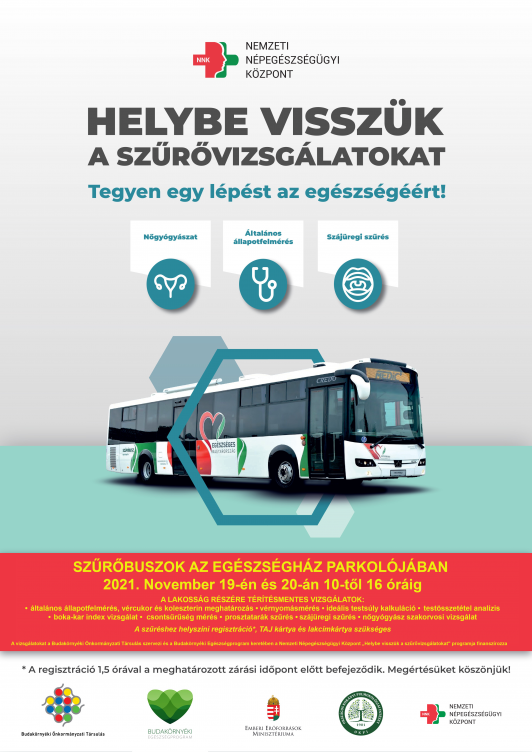 November 19-én, pénteken és 20-án, szombaton 10 és 16 óra között Biatorbágyon az Egészségház parkolójában a lakosság részére térítésmentes egészségügyi szűrővizsgálatok lesznek. A vizsgálatokat a Nemzeti Népegészségügyi Központ programja finanszírozza.