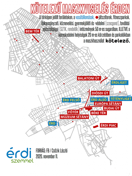 Szigorúbb járványügyi intézkedések léptek életbe hazánkban november 12-től. Szerda óta Érd számos forgalmas pontján vált kötelezővé a maszkviselés, erről hozott rendeletet a képviselőtársak bevonásával Csőzik László, Érd polgármestere.