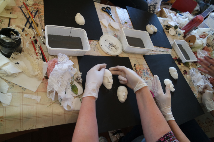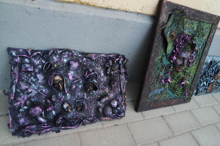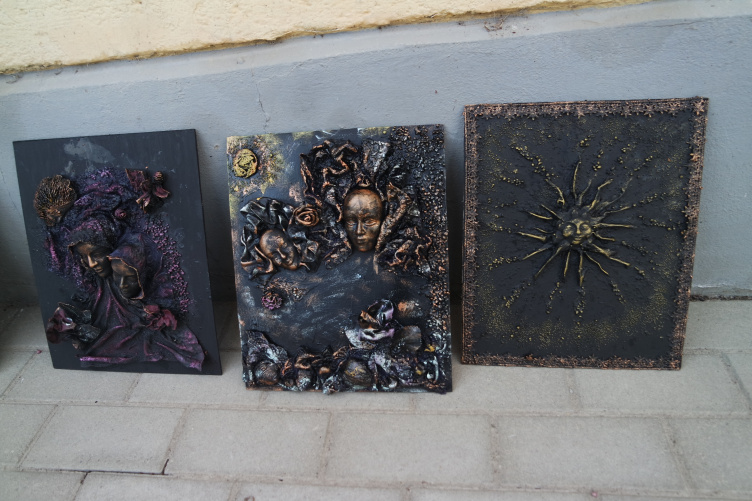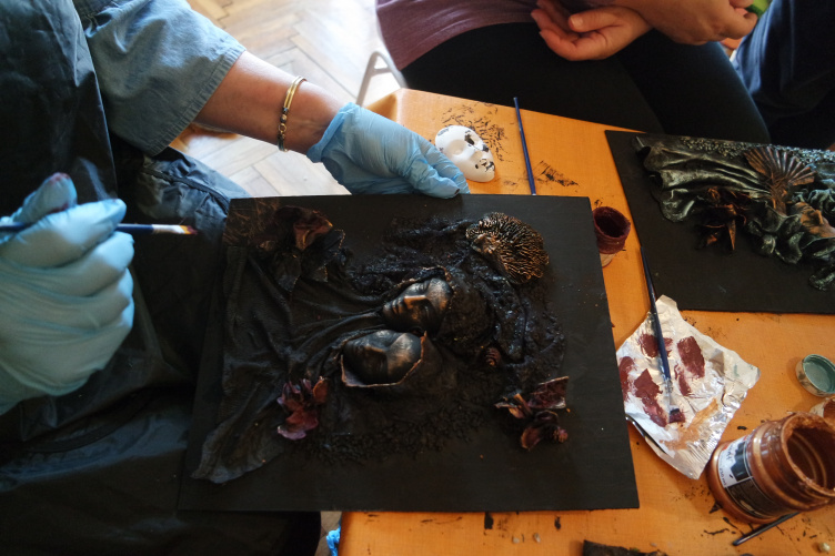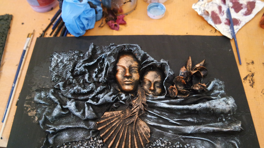 Miközben beszélgettünk, a textilszobrász bemutatta a paverpol technika alapjait. Ezt igazából – Piroska szakértői irányítása mellett – nem volt nehéz elsajátítani. Amire szükség volt, az a fantázia, a szín- és arányérzék, no meg a koncepció, hogy mit is szeretnénk létrehozni. Az alkotás folyamata annyiféle részből állt, hogy cseppet sem volt unalmas: anyagválogatás, festés, ragasztás, szárítás, ismét festés… Ami önbizalmat adott, az az, hogy az elrontott részleteket is lehetett javítani. Az eredmény pedig magáért beszélt.