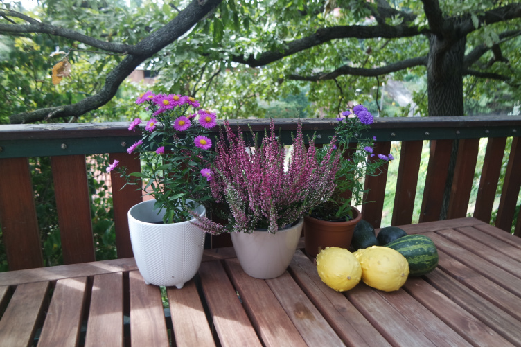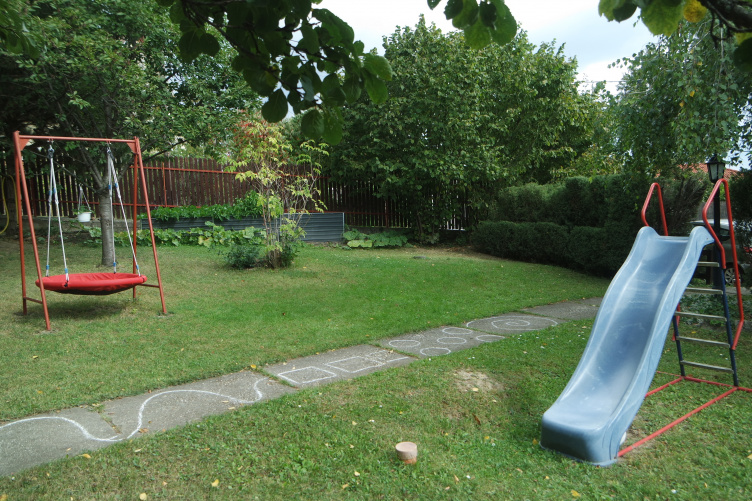 Van az érdligeti kertben minden: idősebb és fiatalabb fák – közte meggy és füge –, bokrok, szelíd rózsák, és egy hatalmas füves rész is, ahol nagyon jókat lehet játszani. „Tavasszal teli van százszorszéppel, ibolyával. Nagyon szeretjük. És itt van ez az óriásfenyő, amit az előző tulajdonosok elneveztek Bertának, és már a mi kislányunk is így hívja ” – mutatott Bogi a ház mellett hajladozó fenyőre. Egy kis veteményes is helyet kapott kertben. „Volt itt egy régi magaságy, de teljesen elkorhadt, a szétmállott fát apránként szedegettük szét, és építettünk egy újat. Tavasszal borsó, most bab, paprika van benne, mellette tök, fűszernövények, és volt paradicsomunk és eprünk is. Örököltünk a telekkel egy komposztálót, azt is használjuk. A szüleinktől, illetve internetes kertészeti csoportoktól kapunk tippeket, rendszeresen járunk gazdaboltba, kertészetbe is, és ott is nagyon kedvesek, mindig adnak tanácsot” – mondta Bogi, aki a kislányával is szokott kertészkedni, a három és fél éves óvodás már örömmel segít.