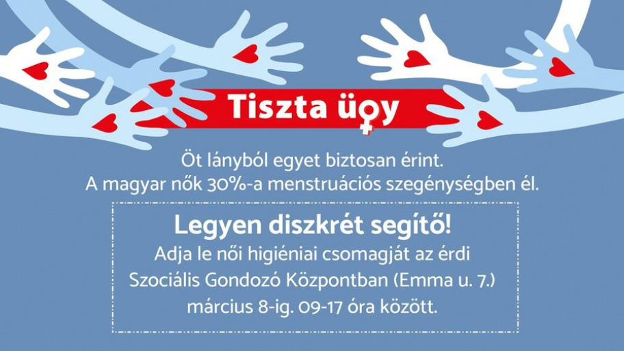 A női higiéniai segítő csomagot március 8-ig adhatja le az érdi Szociális Gondozó Központban. Érd, Emma u. 7.-ben munkanapokon 9:00 - 14:00 óra között. Ha nem megfelelő az időpont, az egyeztetéshez hívja a 06-23 520-362-es számot.