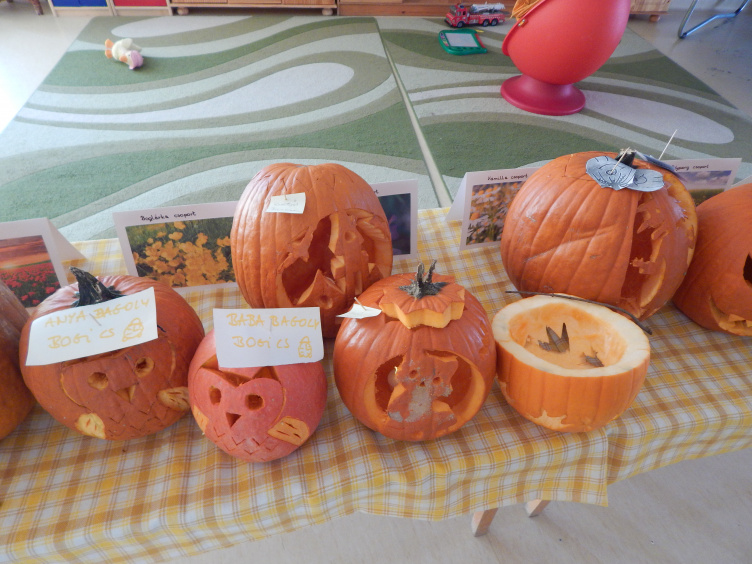 A Pitypang csoport ovisai arról lelkendeznek, ki milyen tökfejet faragott ki anyával és apával közösen. Timi azt meséli, hogy az övének bár hosszú fogai voltak, de inkább vicces lett, mint félelmetes. Barnabásék csontvázasat csináltak, ami saját bevallása szerint nagyon nehéz volt, bár igazából anyukája faragta ki. Bencéék számosat és persze rettentően ijesztőt faragtak, és már alig várja, hogy pénteken hazavihesse és kitehesse otthon mécsessel a belsejében. Katalin, egy anyuka éppen végzett már, amikor megszólítom, azt mondja, a lényeg ilyenkor az, hogy együtt van a család az óvodában is, amit a gyerekek rettentően élveznek. "Miközben farigcsáljuk a tököt, jobban megismerjük egymást. Mivel kicsik a csoportok, ezért van idő és alkalom arra, hogy beszélgessünk, és a nap végére arcokhoz tudjuk kötni a neveket, és mi, szülők is jobban megismerjük egymást."