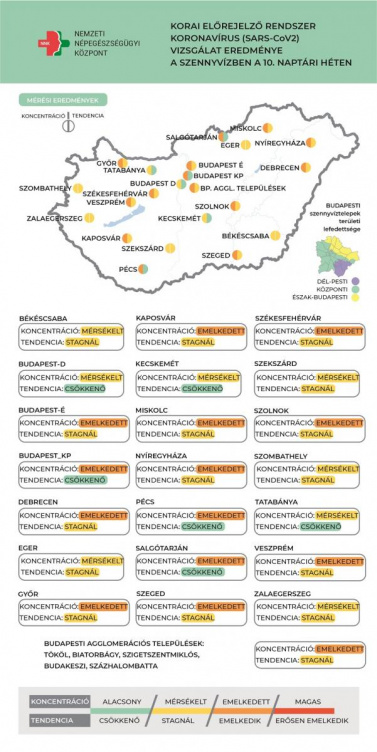 A vírus örökítőanyagának koncentrációja nyolc vizsgált település esetében a "mérsékelt", míg 14 esetben továbbra is az "emelkedett" kategóriába sorolható - írták.