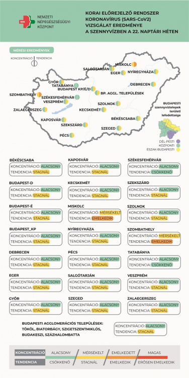 Az NNK megjegyzi, a 22. héten a tavaly nyáron mért átlagos értékek szintjére még nem csökkent vissza a koronavírus koncentrációja. Kitértek rá, a 22 vizsgált minta többségében nem változott és alacsony maradt. Csupán Szombathely és Miskolc esetében figyelhető meg enyhe növekvő tendencia, míg Székesfehérváron és Tatabányán csökkent.