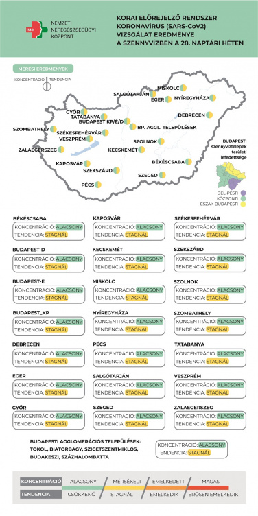 A 28. héten továbbra is alacsony szinten stagnál a vizsgált helyszínek szennyvíz mintáiban a SARS-CoV-2 koronavírus koncentrációja, emelkedés egyik településen sem tapasztalható - derül ki az NNK honlapján közzétett tájékoztatóból.