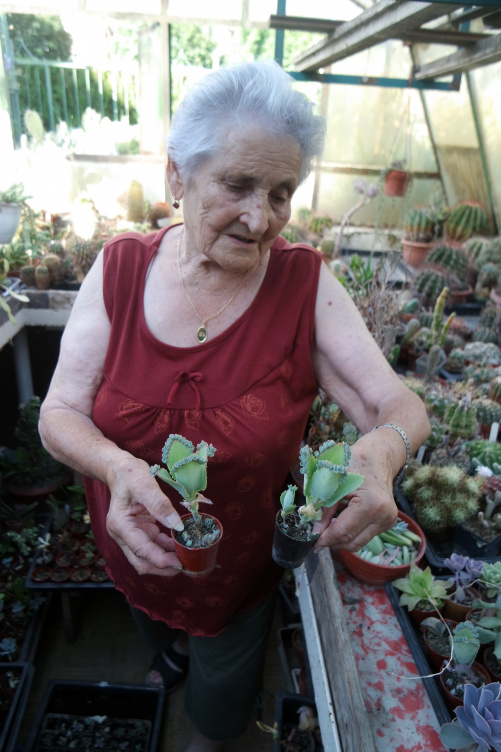 „Nem is őket akartam vinni, de úgy virágoztak, hogy hirtelen eldöntöttem, a Mamilláriákat teszem be a kocsiba” – meséli Ica néni. Egy napfényes, meleg délutánon látogattam el hozzá, a mesebeli kertjébe, ahol egy embernél is magasabb télálló kaktusz uralja a sziklakertet, nem messze tőle pedig ott az üvegház, megannyi egzotikus csoda otthona. „Több ezer kaktuszom van. A délelőttöket kint töltöm, velük. Többórás elfoglaltságot jelentenek naponta” – mondja Ica néni, aki naiv kérdésemre, hogy nem süt-e nagyon oda a nap az üvegházra, nevetve mondja, hogy dehogynem…