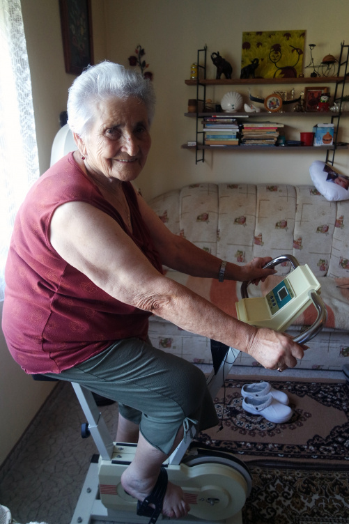Segítségem akkor volt, amikor került elegendő pénzem, hogy megvendégeljem azokat, akik szívességből dolgoztak nálam. Munkásszállón voltam gondnok, szerettek a lakók, örömmel jöttek. Amikor nem tudtam enni-inni adni, inkább azt mondtam, nincs éppen semmi teendő. Ma már el se hiszem, hogy volt erőm egy építkezéshez, miközben a gondnokság mellett még takarítást is vállaltam, hogy legyen pénzem. Ha csak két sor téglát húztam fel, mert annyi fért bele a napba, akkor annyit, de csináltam folyamatosan. Megtanultam a vakolástól kezdve sok mindent. Amikor a munkásszálláson a szakember úgy építette be a zuhanyzót, hogy az nem a lefolyó felé lejtett, rászóltam. Felháborodott, hogy hogy merem kritizálni, tán értek hozzá?! Mondtam, hogy igen, és hogy ezeknek az embereknek ugyanúgy kell megcsinálni, mint az atyaúristennek! Szerettek is a lakók, azt mondogatták, jobb vagyok hozzájuk, mint az édesanyjuk. Aztán ’89-ben leszázalékoltak. Még ’82-ben megsérültem egy autóbalesetben, többször műtöttek, azóta is nyögöm. Elütöttek Budapesten, az utcán, nem az én hibámból. Utána még a testvérem boltjában dolgoztam tizenhét évig. Ma is aktív vagyok, szobabiciklim is van, a fiamtól kaptam” – mutatja a gépet Ica néni, a kedvemért felül és tekeri…