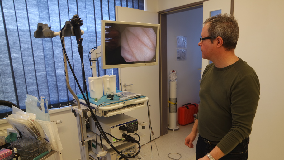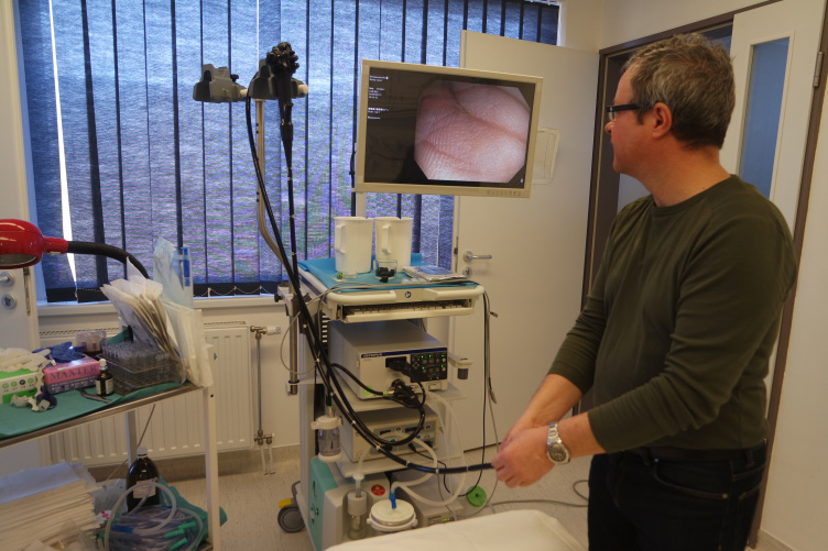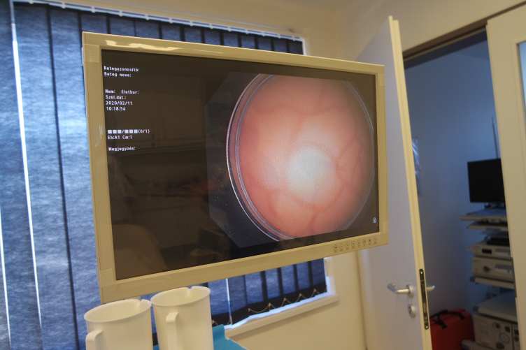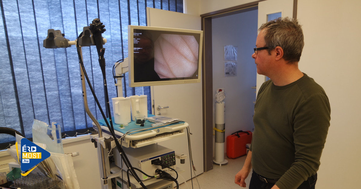 Az egyik most érkezett műszer a modern képfeldolgozó rendszerrel, nagyobb felbontással rendelkező endoszkópos berendezés, ami a gasztroenterológián kapott helyet, és ami egy tízéves készüléket vált ki. Tanúi lehettünk, milyen tűpontosan és részletgazdagon jeleníti meg a monitor a kamera elé tartott tenyerünket. Ugyanígy alkot képet a gép a gyomorról és a bélrendszerről.