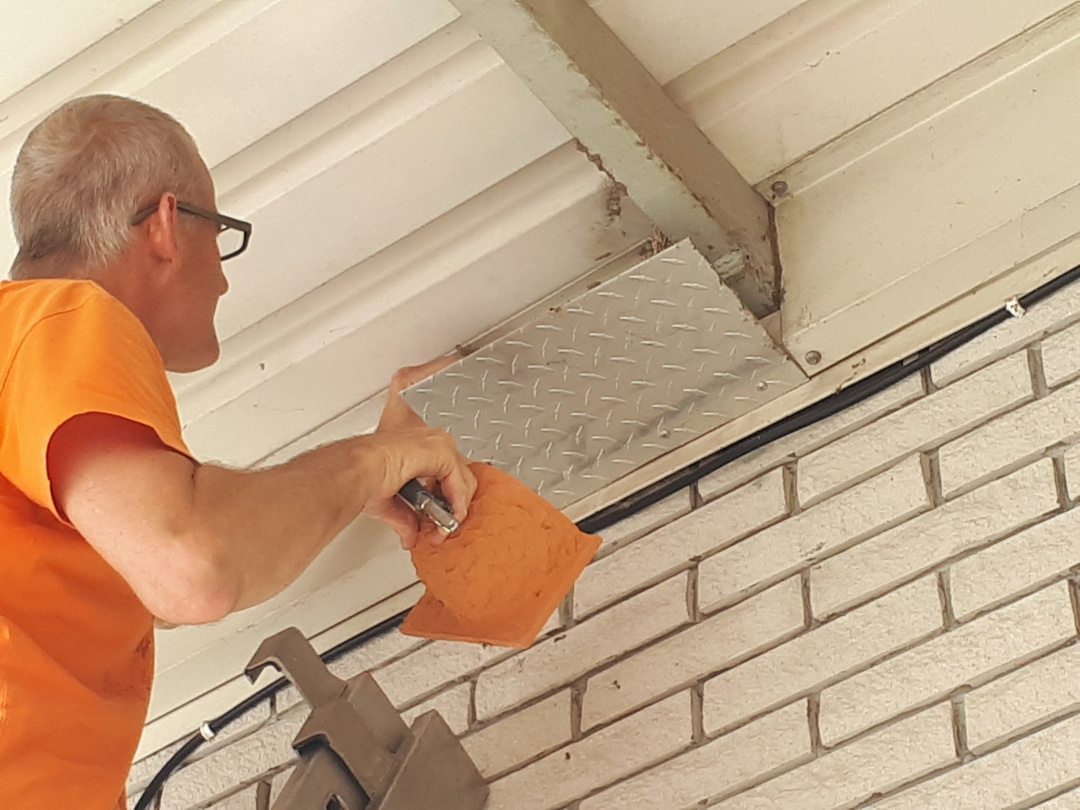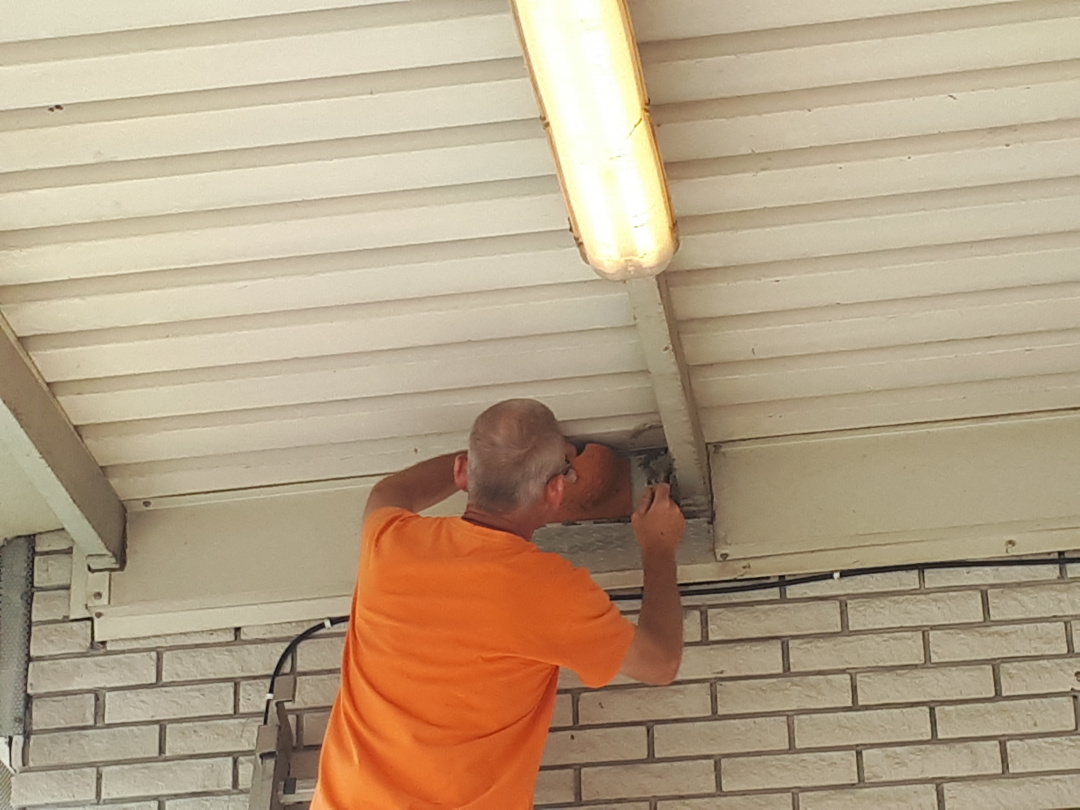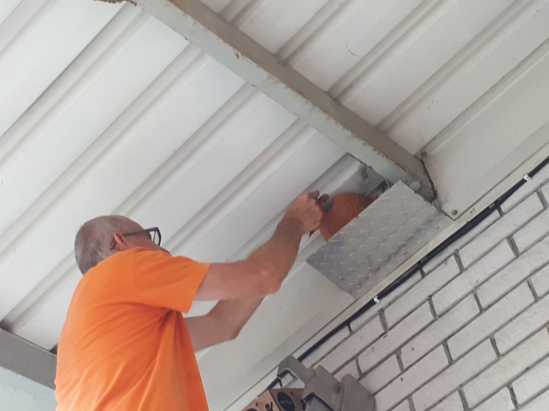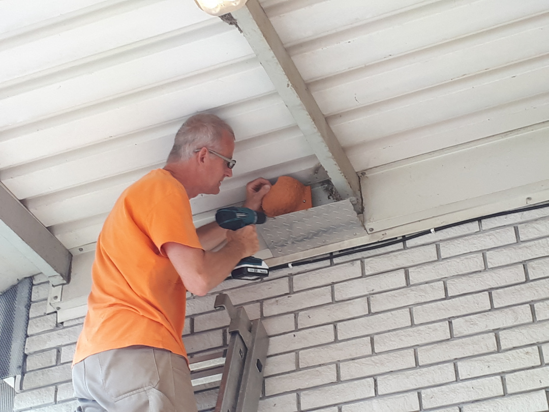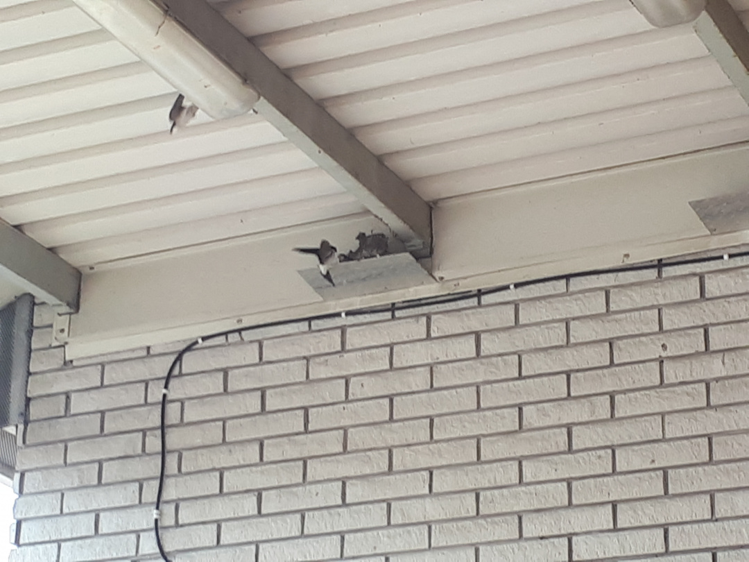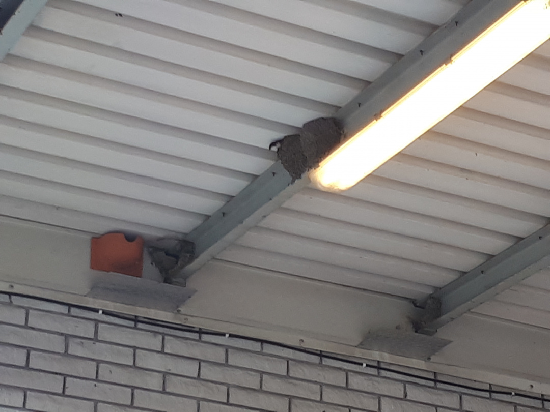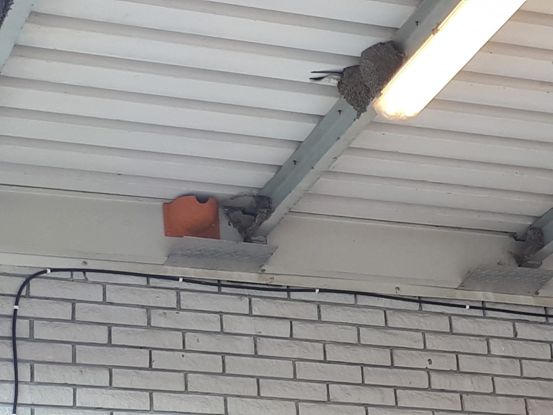 Mi is odasiettünk, ahol kiderült, hogyan történhetett a baleset: a tollas csöppségek fészke már félig szétesett, valószínűleg a vihar tépázta meg. A Spar munkatársai, akik megitatták és biztonságba helyezték őket, amíg ki nem értünk, azt mondták, egy gerle is el akarta időnként foglalni a fészküket, lehet, hogy ő túrta ki onnan a két fiókát. Mindenesetre a fészek, amiben még három további molnárfecske fióka is meghúzódott, nem tűnt túl biztonságosnak, úgyhogy Kriszta egy, az MME által gyártatott műfészekre cseréltette le az eredetit Zsákovics Andrással, a Városfejlesztési Kft. munkatársával.