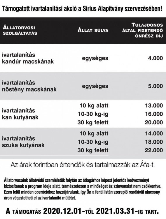 A 2020. december 1-től induló és 2021. március 31-ig tartó akció az operáción kívül nem tartalmaz többletszolgáltatást (műtéti gallér, kórházi elhelyezés, stb.), ellenben a műtét közben felmerülő gyógyszerköltségeket igen. Az állatorvos nem számol fel díjat a varratszedésért, de előre nem látható komplikációk esetén minden további költség a tulajdonost terheli.