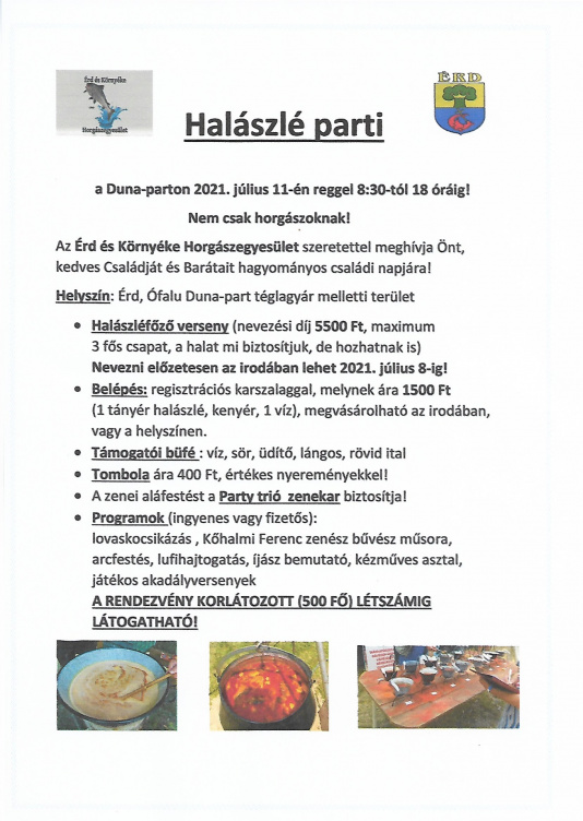 Mint Berényi Andrásné, az Érd és Környéke Horgászegyesület elnöke elmondta, a pandémiás helyzet sem zavarta meg a szervezőket, akik remélték, július közepére már tudnak programokat szervezni, így július 11-én már tizenhetedik alkalommal tartanak családi napot – természetesen központban a halászléfőző versennyel.