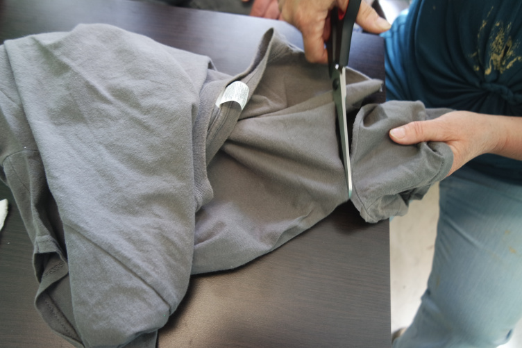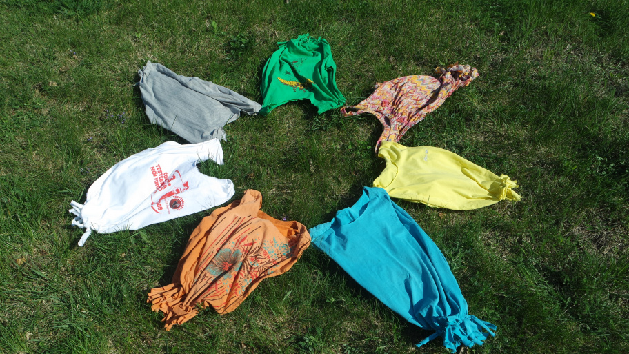 A módszer nagyon egyszerű: a varrás mentén levágjuk a póló ujjait, és máris megvan a két fül, ahol megfoghatjuk a szatyrot. Ha kell, a nyakánál is levágjuk a varrást, így nagyobb lesz a szatyrunk szája, könnyebben tudunk bele pakolni. Ezt követően levágjuk a póló aljáról is a varrást, majd az anyagot körülbelül tíz centiméter mélyen bevagdossuk, úgy, hogy körülbelül két centi széles fülecskéket kapjunk. Végezetül az egymással szemben lévő füleket szorosan csomóra kötjük, így megkapjuk a szatyrunk alját – mondta, illetve mutatta Gabi, aki nemcsak magának gyárt ilyen szatyrokat, hanem azoknak a boltoknak is, amelyek vállalják, hogy alternatívaként – és természetesen ingyen – felkínálják ezeket a vásárlóknak az eldobható zacskók helyett.