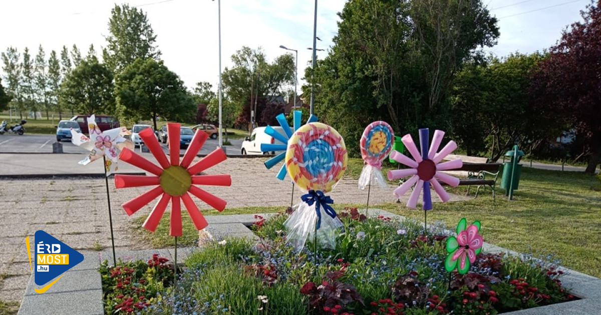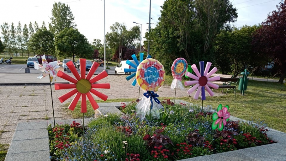 De nem csupán növényekkel lett színesebb a település: az Egészségház előtti virágágyás kapott néhány kedves, újrahasznosított technikával készített díszt. Már üres, ipari orsókból készültek a virágszirmok, a nyalókák már nem használt polifoam úszónudliból, az egyik szélforgó pedig egy üres műanyag dobozból. Ezzel a meglepetéssel köszöntik a gyerekeket a Tárnoki Kertbarátok.