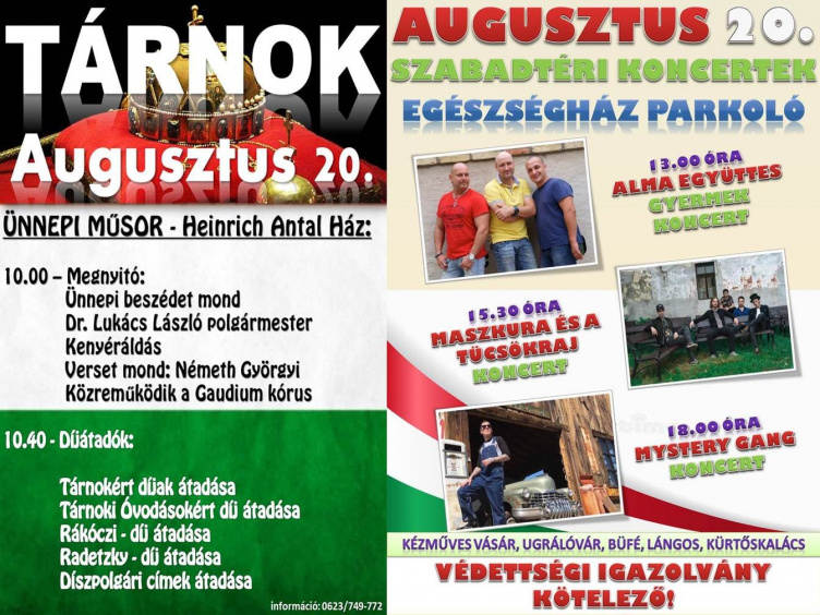 A hatályos jogszabályok értelmében mindent megtettünk annak érdekében, hogy bármilyen programot is tudjunk szervezni a településen. Ezek a szabályok a jelenlegi állapot szerint, az augusztus 20.-ai rendezvényt zenés, táncos rendezvénynek minősítik. A zenés, táncos rendezvényeken minden esetben kötelező a védettségi igazolvány felmutatása, nincs mérlegelési jogkörünk.