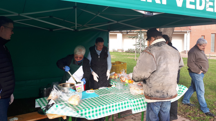 Még nincs 12 óra, de Fülöp Sándorné Magdolna és kis (,főleg családtagokból álló) csapata már jórészt kiosztotta a karácsonyi ebédet: gulyáslevest kenyérrel, gyümölcsöket és szaloncukrot. Vendégeik között sok olyan van, akit már ismernek az előző és az azt megelőző évek ételosztásaiból. Ismerősökként, jókedvűen beszélgetnek egymással. Magdolna kérdésünkre elárulja, hogy 80 adag ételt készítettek, ha marad belőle, akkor azt a hajléktalanszállóra fogják elvinni, de az előző évek tapasztalatai alapján nem sok minden marad majd. Bár idén kevesebben vannak, akik sorba állnak náluk ételért.